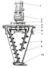 1、電機 2、減速機 3、噴液裝置 4、筒蓋部分 5、6、7、傳動部分 8、螺桿部分 9、筒體部分 10、出料閥 |